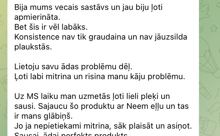 Kad bija Chogan vecais sastāvs un jau biju ļoti apmierināta. Bet šis ir vēl labāks. Konsistence nav tik graudaina un nav jāuzsilda plaukstās. Lietoju savu ādas problēmu dēļ. Ļoti labi mitrina un risina manu kāju problēmu. Uz MS laiku man uzmetās ļoti lieli pleķi un sausi. Sajaucu šo produktu ar Neem eļļu un tas ir mans glābiņš. Jo ja nepietiekami mitrina, sāk plaisāt un asiņot. Sausai ādai perfekts produkts.
