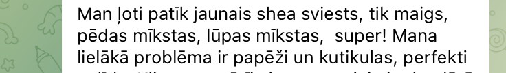 Man ļoti patīk jaunais shea sviests, tik maigs, pēdas mīkstas, lūpas mīkstas, super! Mana lielākā problēma ir papēži un kutikulas, perfekti palīdz.